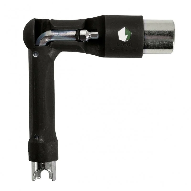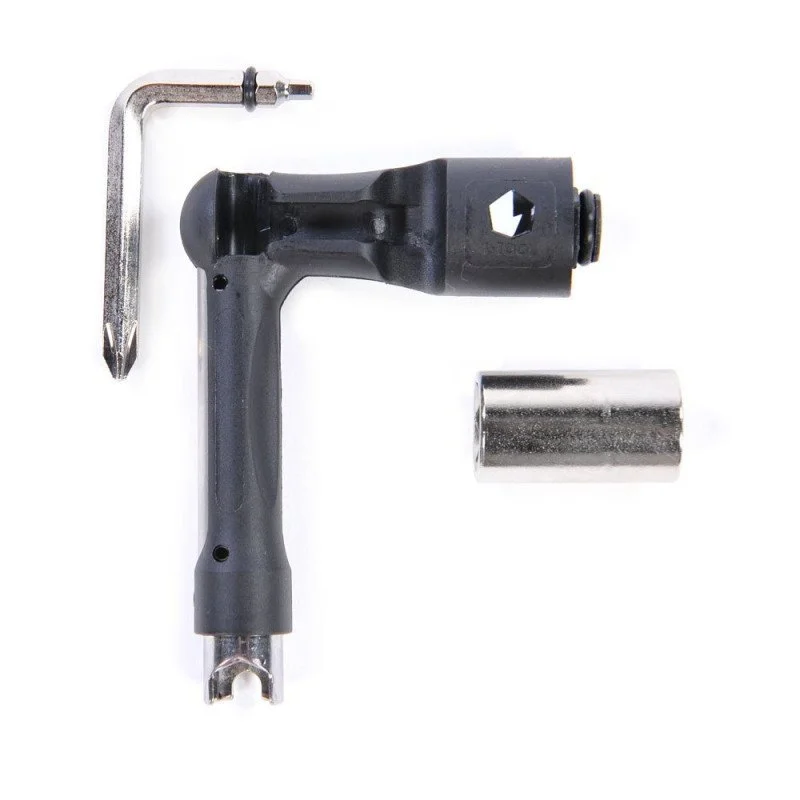 De L-Tool is een handige skateboard tool waarmee je je kingpin, wielen, trucks en kunt vast of losdraaien. Je draait er je wielen mee los, je trucks strakker of losser en schroeft je hardware met philips of imbus sleutel snel los of vast.