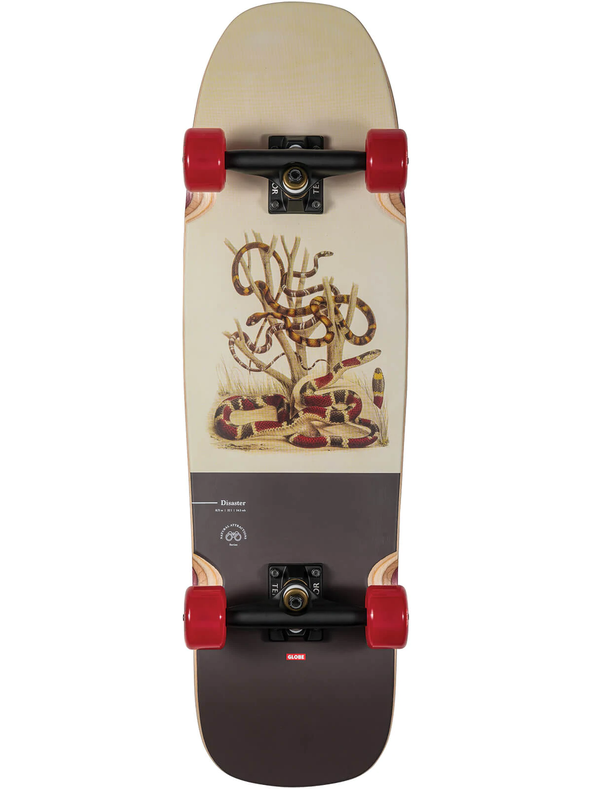 Fully functional shredder with tapered outline and blunted nose and tail. The Distaster in Armadillo is a 32″ inch, mid-size cruiserboard featuring Resin-7 hard rock maple deck allowing for longer lasting pop in the board. Trucks are 6.0” Tensor alloy and feature Grade-8 kingpins and high-rebound urethane bushings. Globe’s high-rebound, 62mm 88a Bruiser Cruiser wheels function in all terrain, with street performance shape and characteristics. Part of our Natural Attractions range, this modern cruiser shape features snake artwork, depicting a not-so furry critter you might encounter on a walk off the beaten path. Best when admired from a distance.