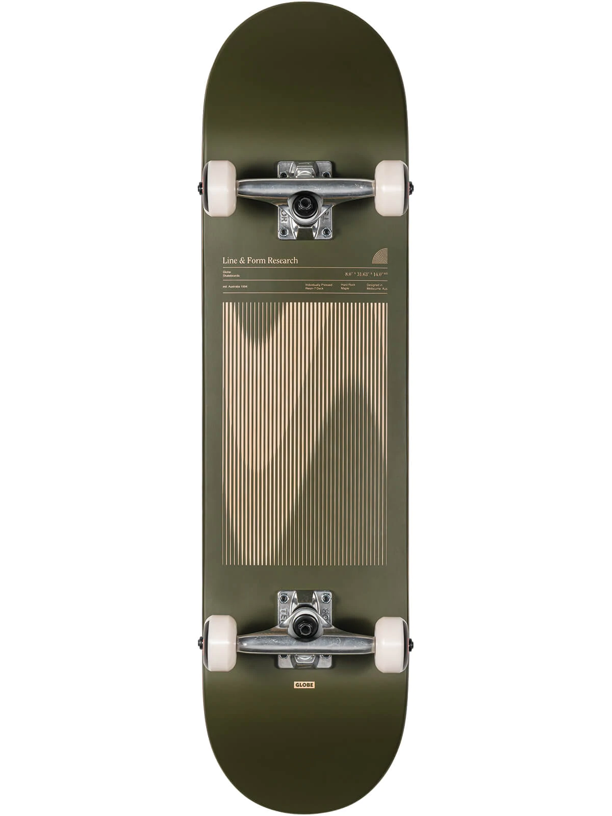 Our standard resin-7 complete skateboard. The G1 Lineform Complete 8.0″ in Olive is constructed from resin-7 hard rock maple with full concave for use in the streets or at the park. This style features 5.0″ tensor alloy trucks with Grade-8 kingpins and high-rebound urethane bushing and are guaranteed for life. Featuring Globe’s high-rebound 53mm 99a durometer wheels for smoother and faster performance.