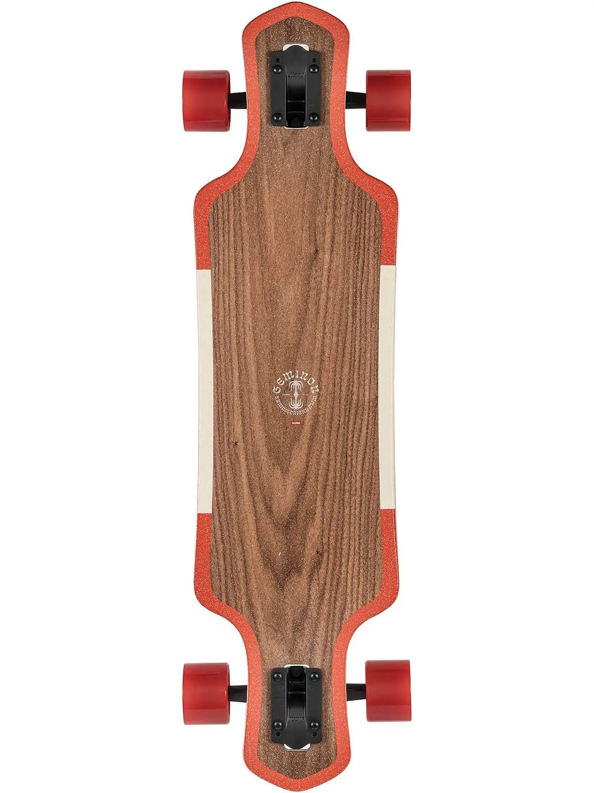 The Geminon 35 in colour Walnut/Cockatoo comes in size 35″ x 9″ x 24.75″wb. Symmetrical cut away longboard with drop-through trucks. It is a Slight side-to-side concave made of Walnut + hard rock maple. It features 180mm Slant reverse kingpin trucks and 70mm 83a Conical Cruiser wheels. Clear broadcast grip.