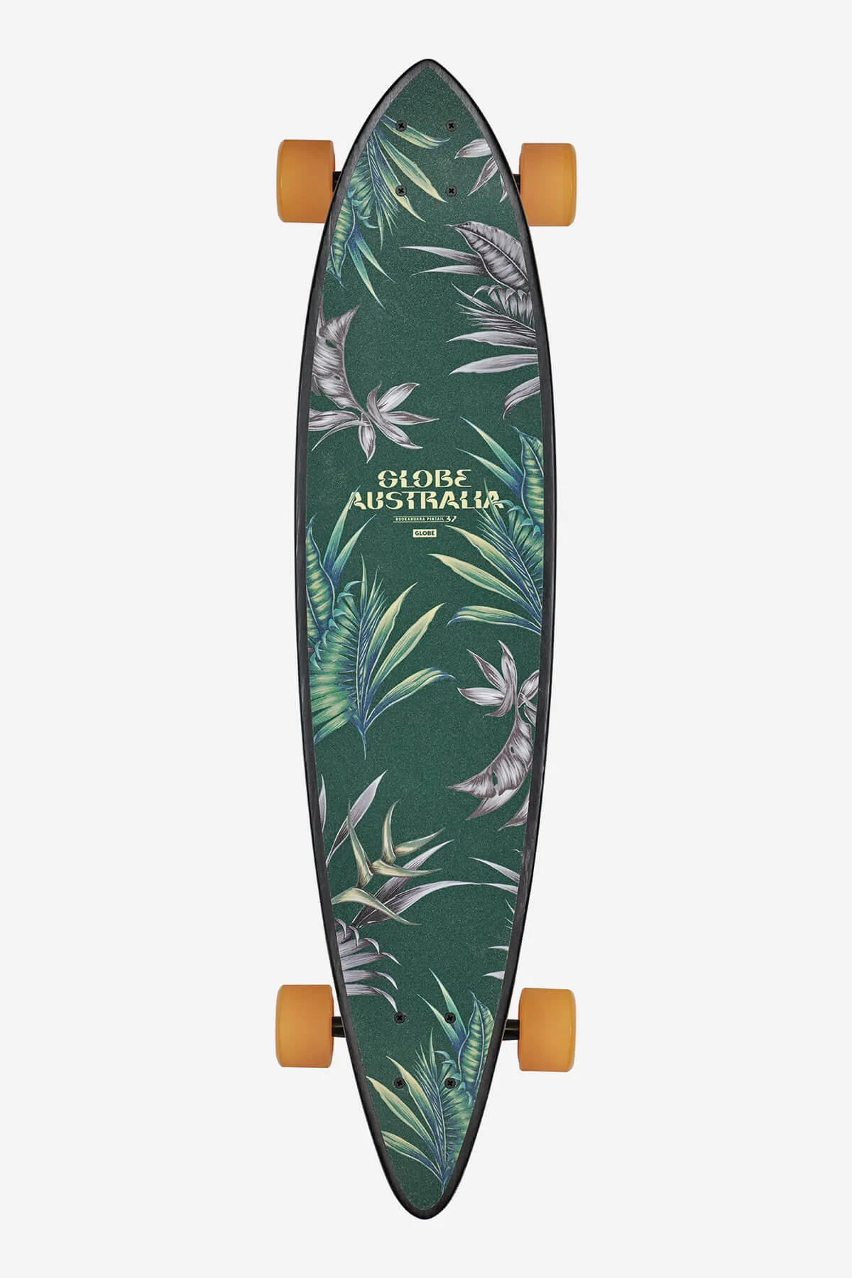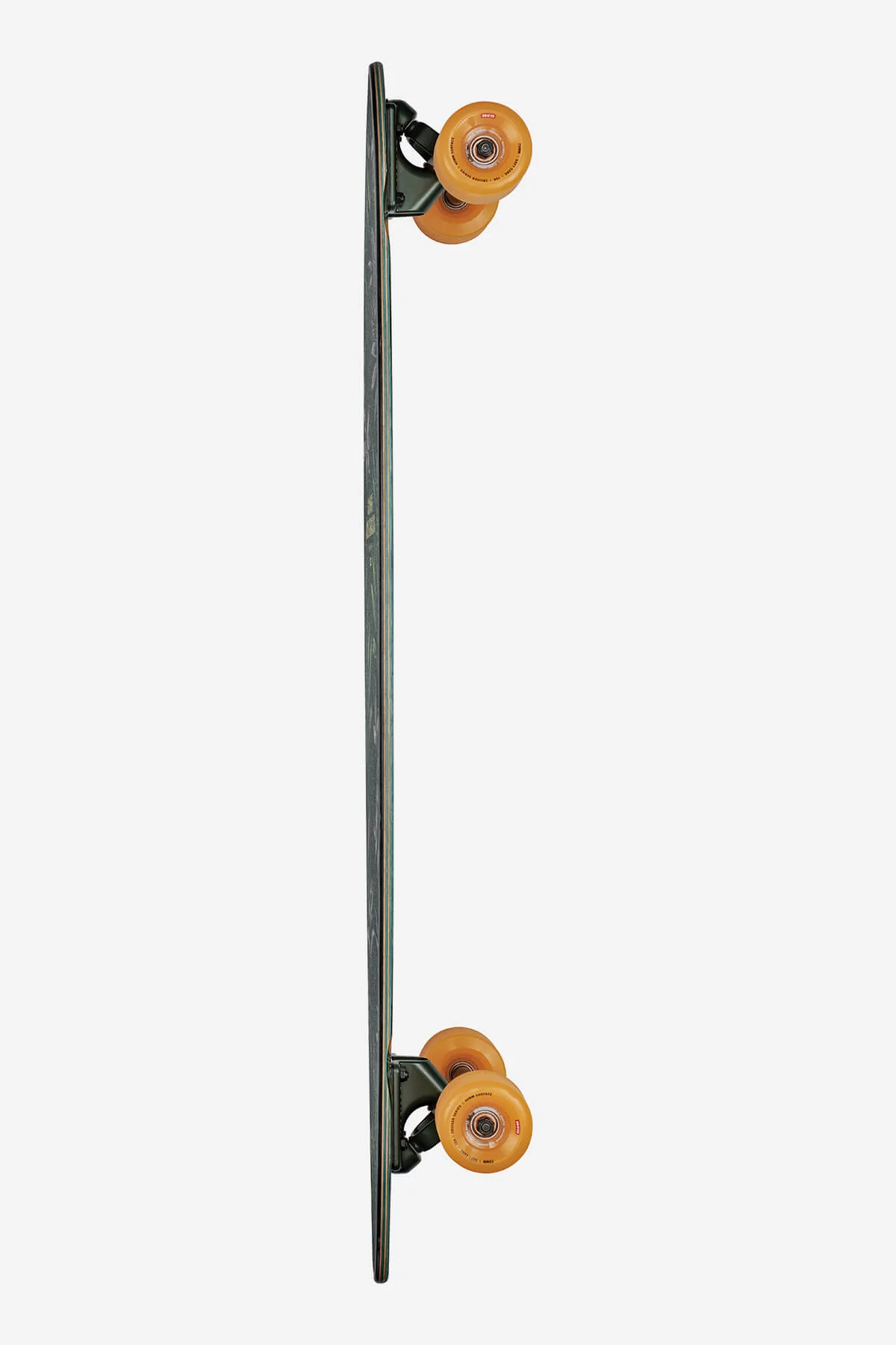 De Pintail 37 in kleur Kookaburra is een full length pintail, zeer geschikt voor carving. Hij is gemaakt van Resin-7 hard rock maple met een vlakke concave. Hij heeft 180mm Slant reverse kingpin trucks en 70mm 78a SoftSider wielen met bedrukte griptape. Verhoogde inkt art details