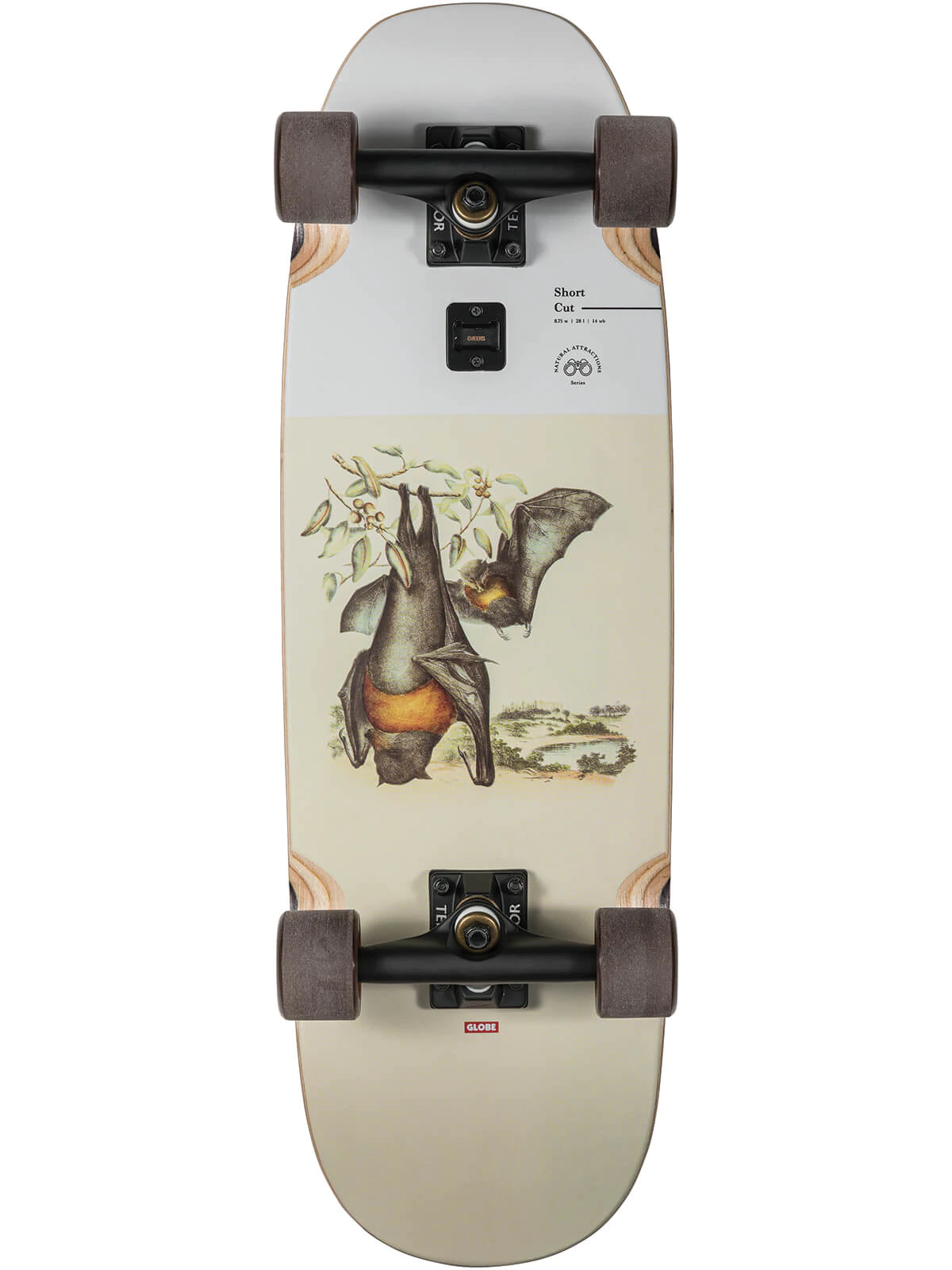 Modern cruiser based on our standard deck shape with the nose cut short. The Short Cut in Flying Foxes is a 28″ inch, compact cruiserboard featuring rosewood + Resin 7 hard rock maple deck allowing for longer lasting pop in the board. Trucks are 5.25” Tensor alloy and feature Grade-8 kingpins and high-rebound urethane bushings. Globe’s high-rebound, 60mm 80a Flatsider wheels are soft for cruising, holds turns and slides consistently. Part of our Natural Attractions range, this modern cruiser shape features flying fox artwork, depicting a not-so furry critter you might encounter on a walk off the beaten path. Best when admired from a distance.