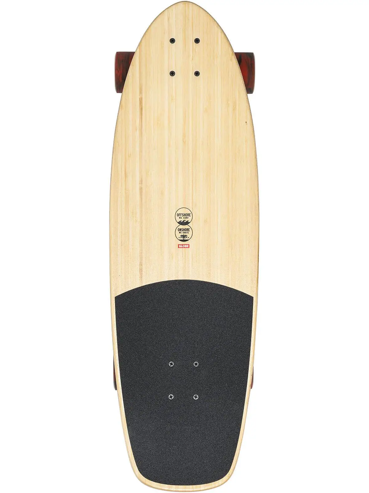 The Zuma in colour Onshore/Flat comes in size 31.5″ x 9.7″ x 18.75″wb. Wider wheelbase board for bigger guys with Revenge surf/skate trucks for a fun surf-like carving experience. It is a Mellow concave with kicktail made of Bamboo. It features 175mm Revenge Alpha II trucks and 70mm 83a Onshore wheels. Black grip + clear broadcast.