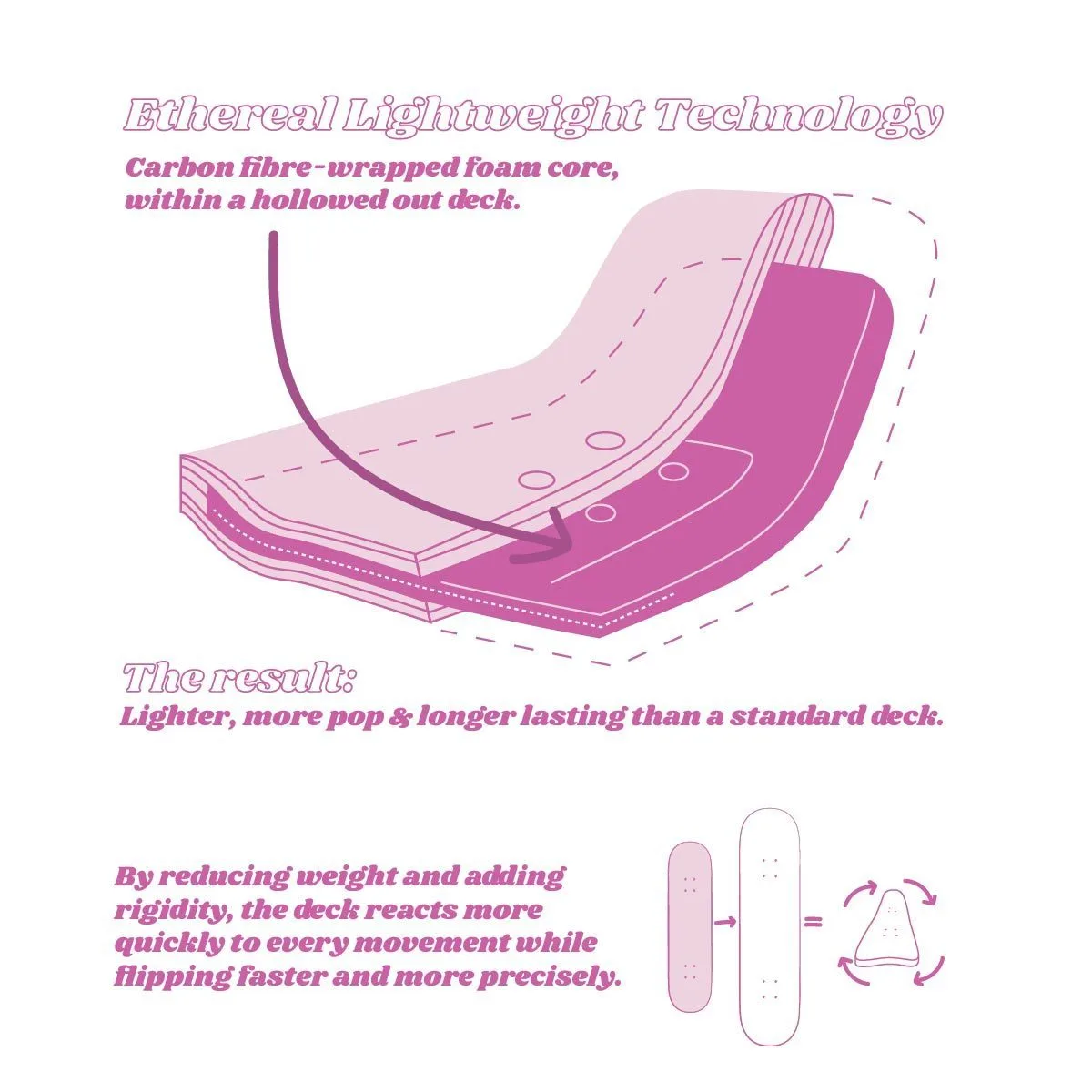 Ethereal lightweight technology – hollowed out deck, with a carbon fibre-wrapped foam core. The result: lighter, more pop & longer lasting than a standard deck.