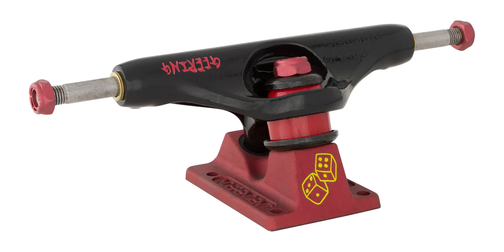 Independent Stage 11 Hollow Breana Geering Pro trucks featuring gloss black hanger with graphic art by Charlie McHarg @appleshift4, anodized red baseplate, red cushions, red plated axle nuts, and black washers.