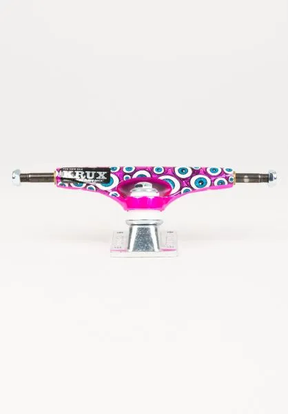 Providing perception beyond ordinary sight, Krux FOS Eyes 2 DLK trucks feature graphic art by Mark Fos @fosgraphics on rhodamine red Krome hanger and silver baseplate.